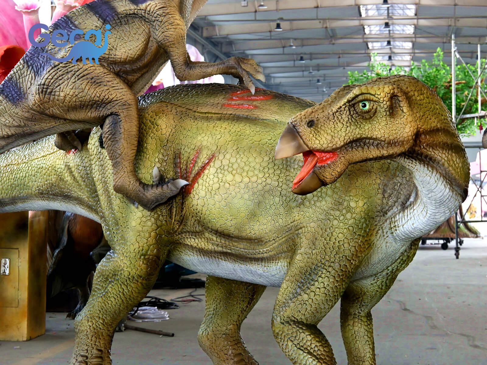 Capture the intensity of a prehistoric battle with the Animatronic Velociraptor and Iguanodon Fighting Set. This dramatic scene features a Velociraptor leaping onto the back of a wounded Iguanodon, frozen in a moment of fierce struggle.