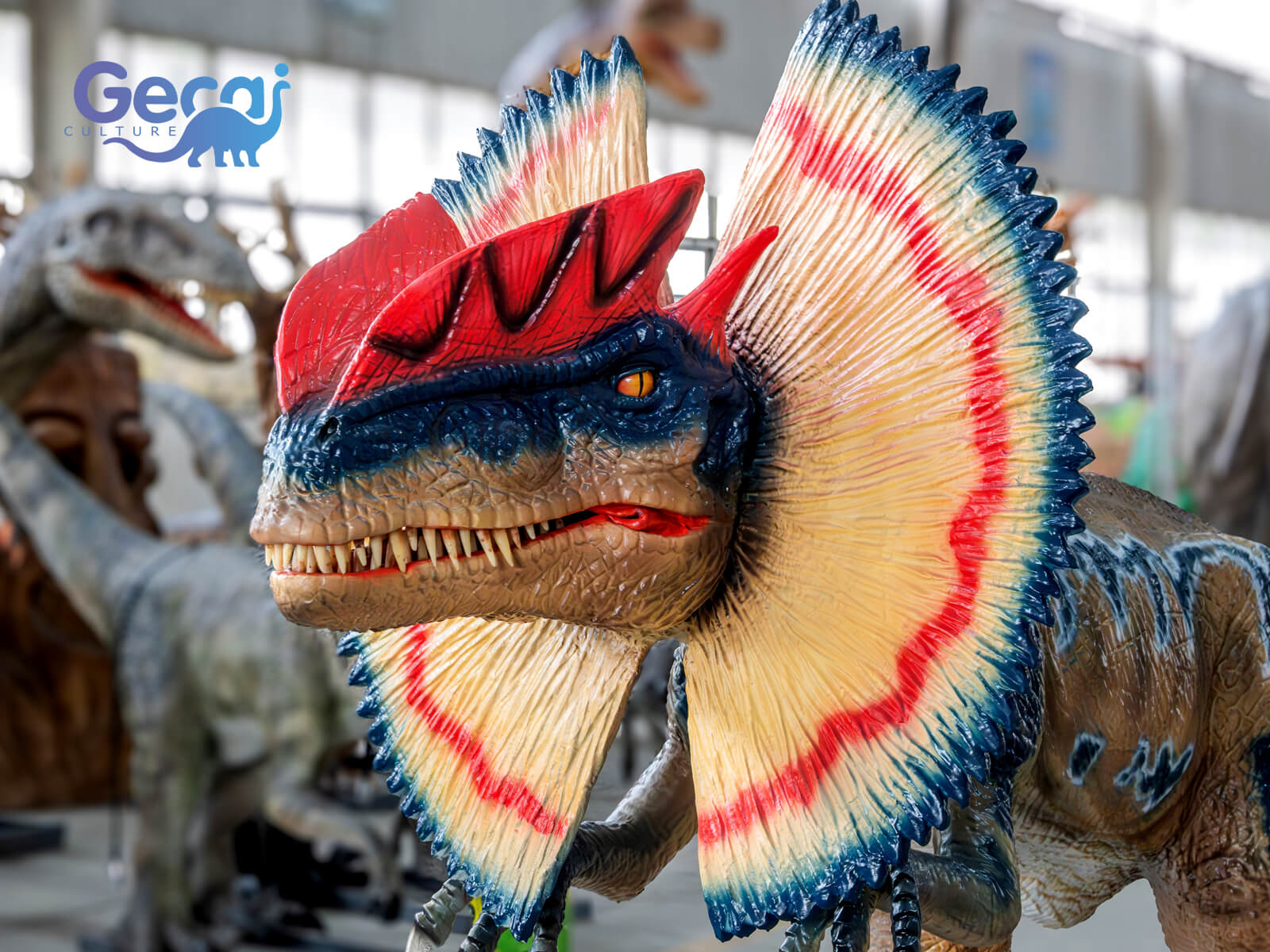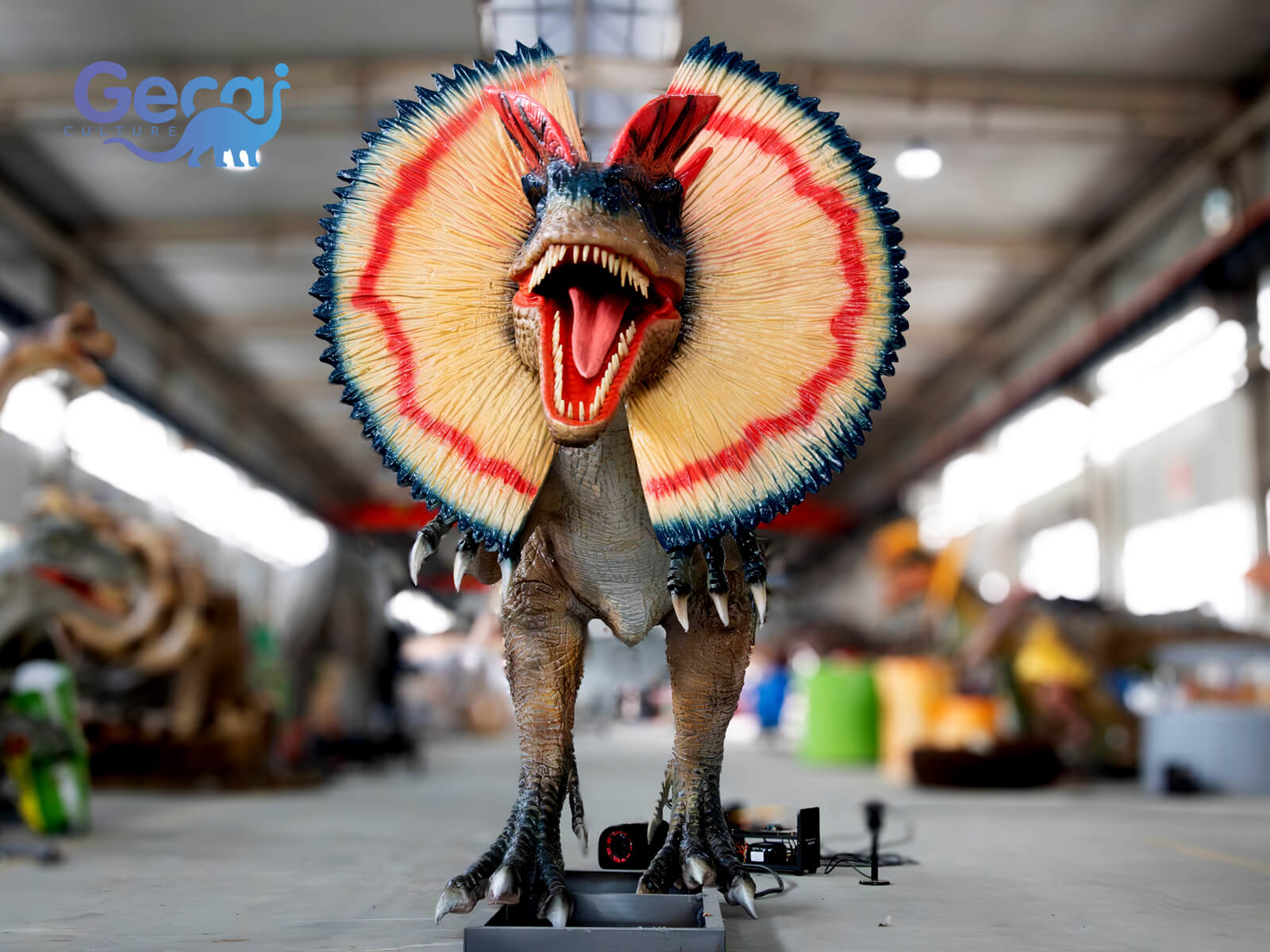Designed with intricate details, the animatronic Dilophosaurus features textured skin, vivid coloration, and realistic movements, including head tilts, mouth openings, and tail sways. Equipped with sound effects that mimic its roars, it provides an engaging and immersive prehistoric experience for visitors.