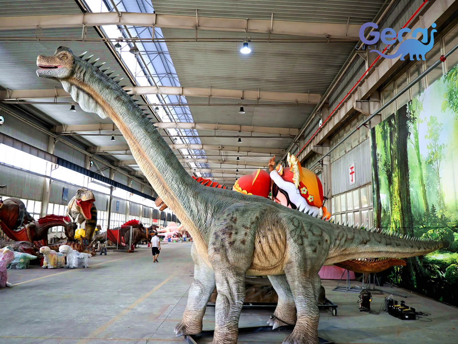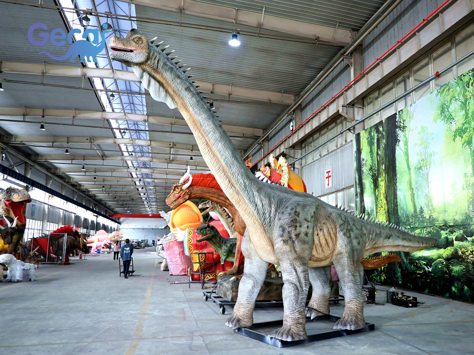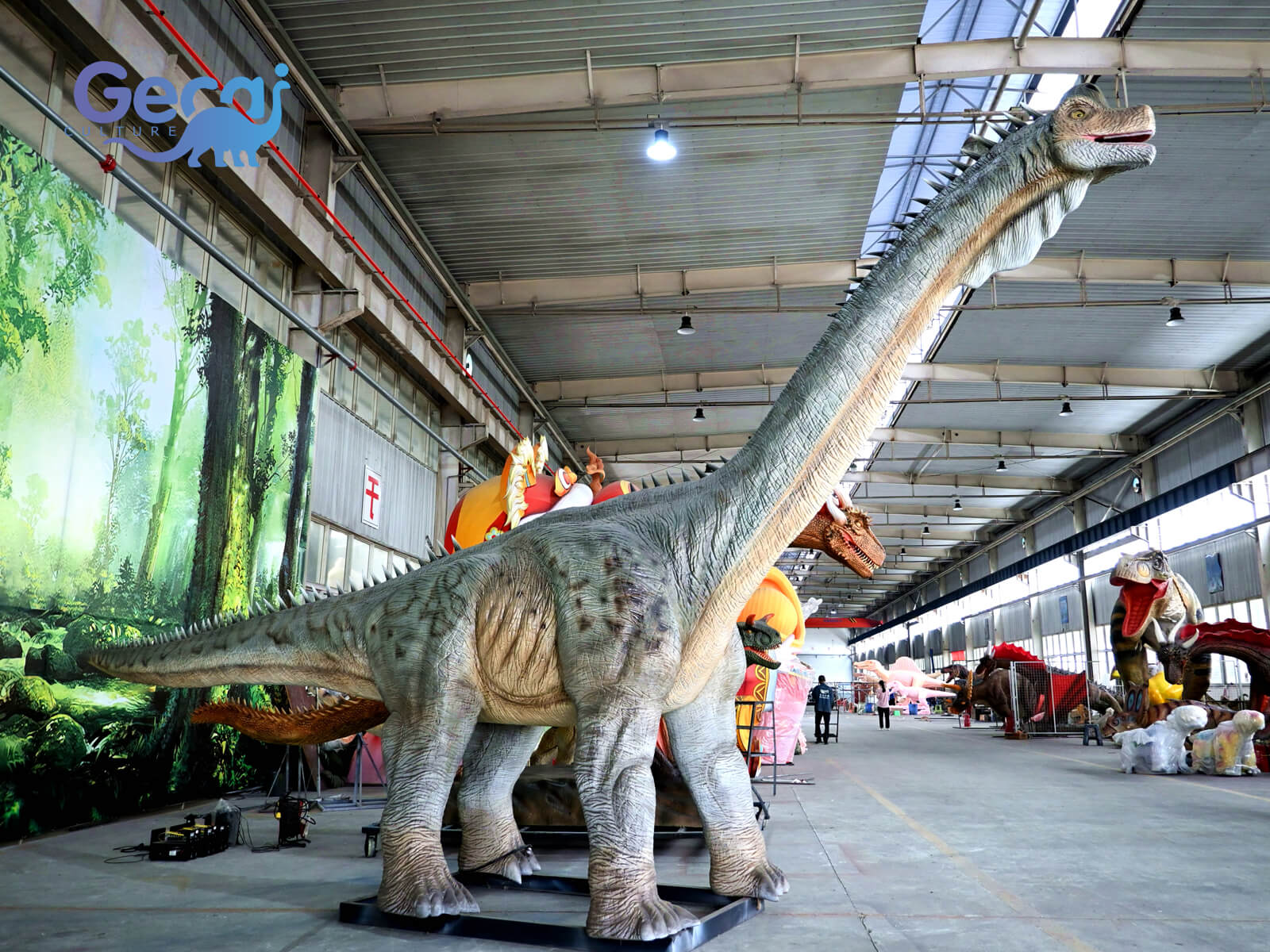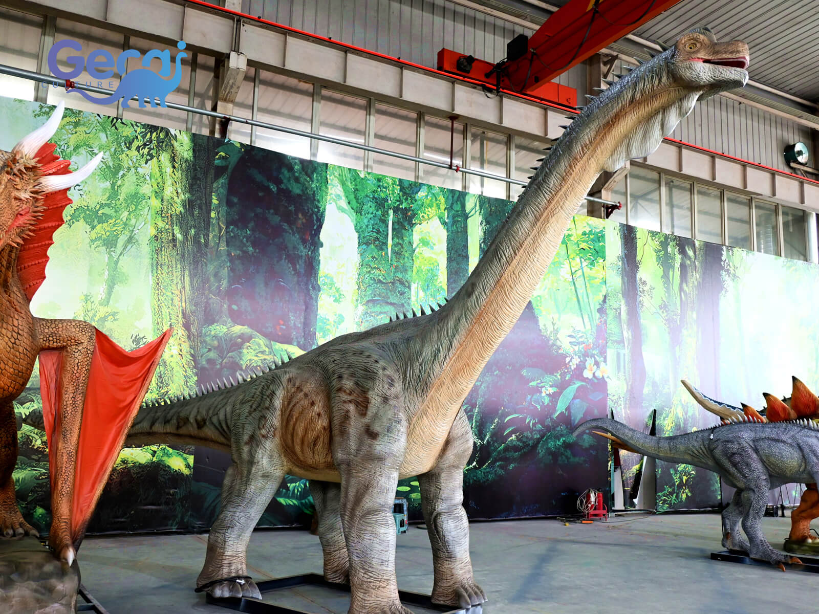 Featuring an impressively tall neck, massive body, and finely detailed skin texture, this animatronic dinosaur moves with astonishing realism. Its gentle head sways, tail motions, and synchronized sounds immerse visitors in a thrilling prehistoric experience.