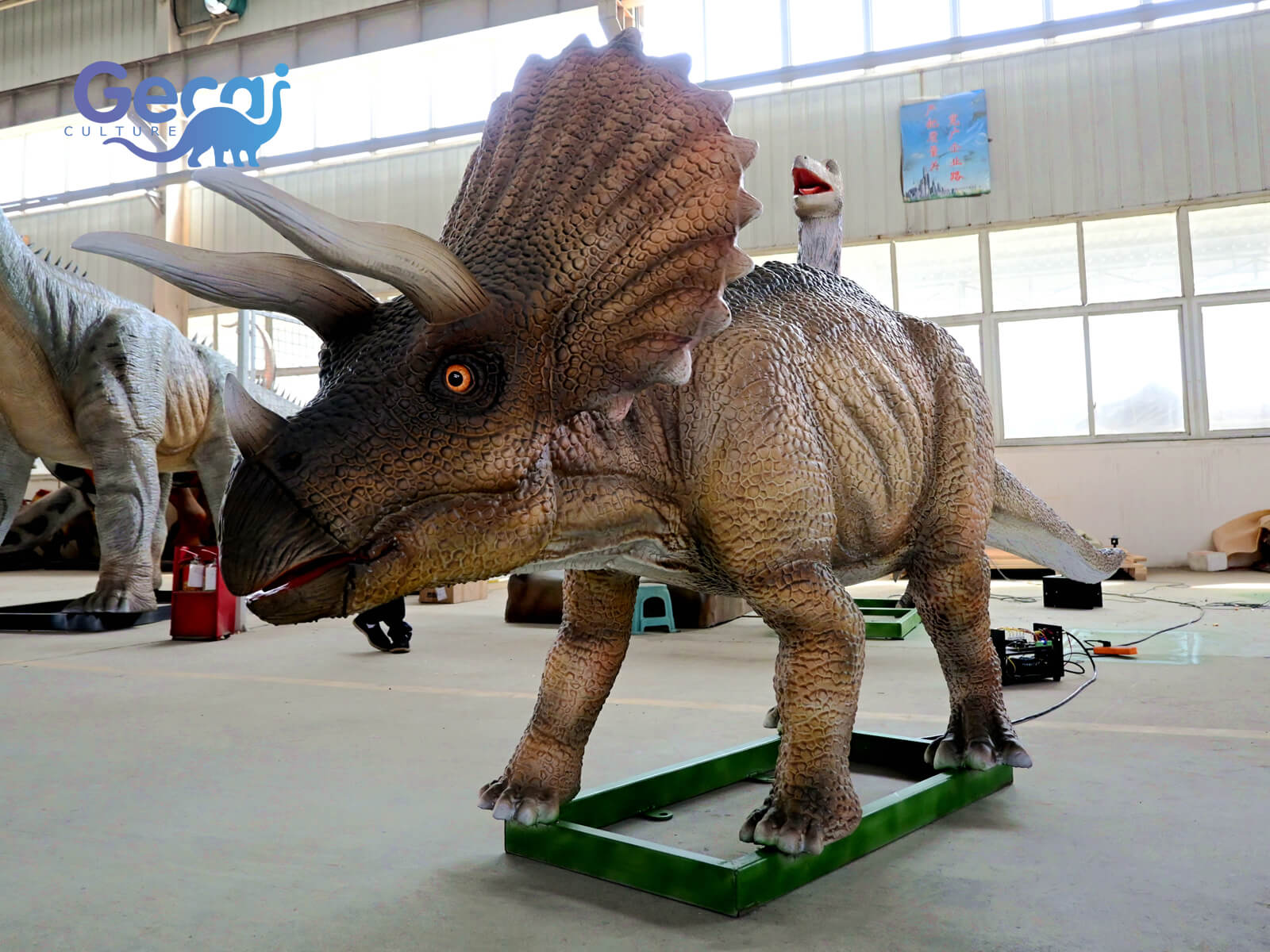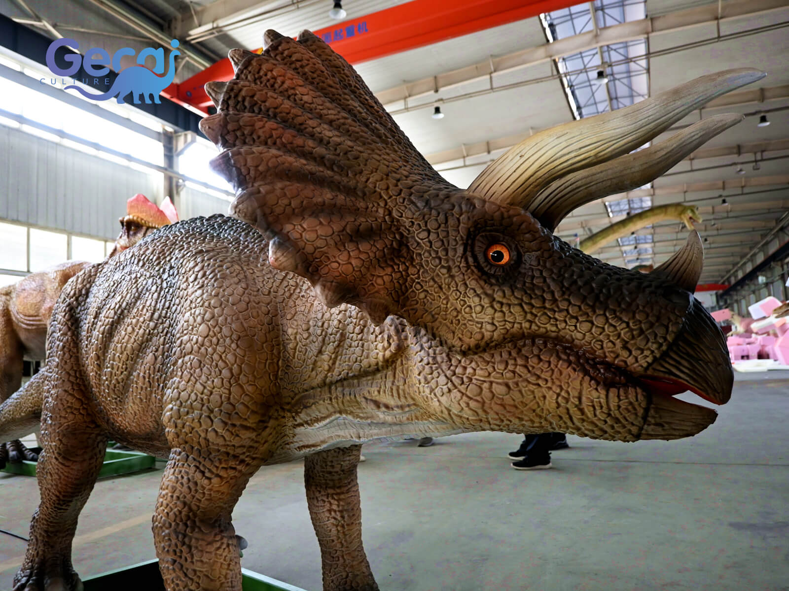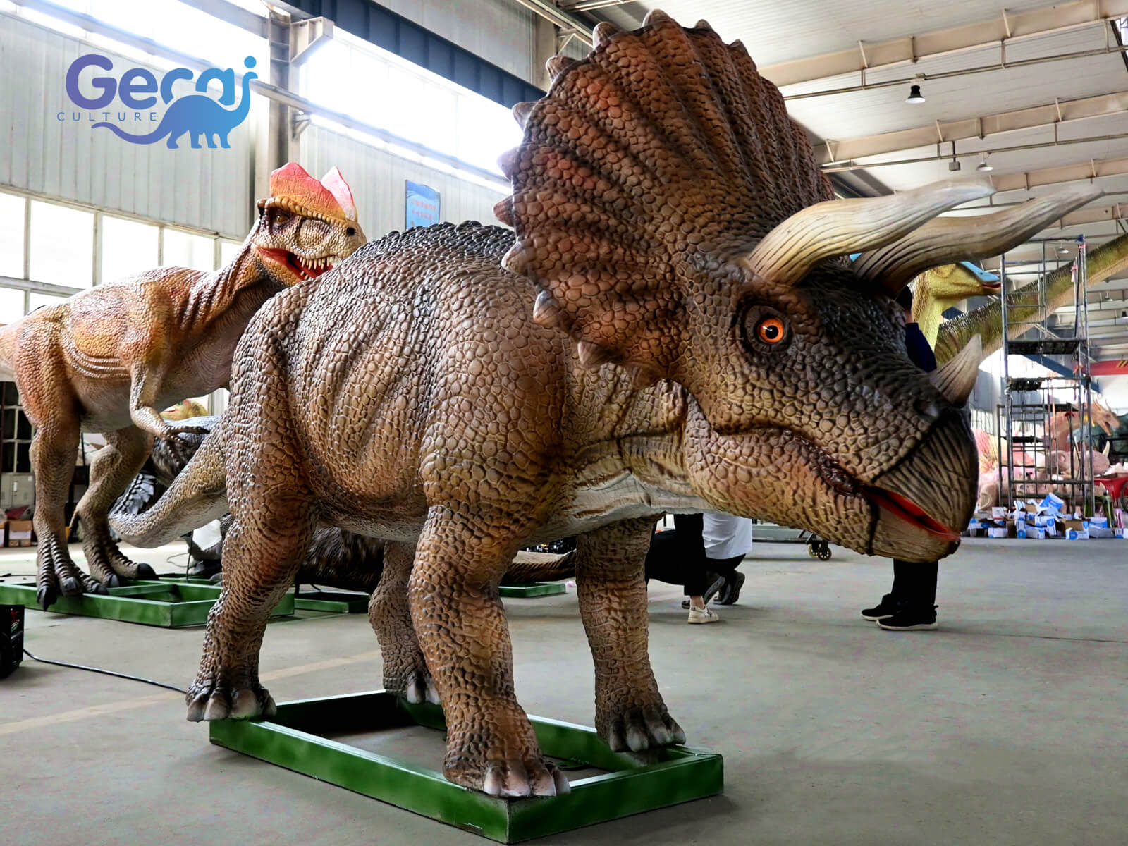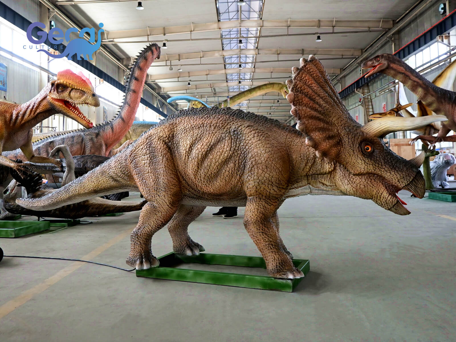 Equipped with smooth animatronic functions—including head turning, blinking, breathing, tail swaying, and gentle roaring sounds—this Triceratops offers a fully immersive experience for park guests of all ages. Its calm yet majestic posture makes it ideal for interactive zones, photo ops, or as a thematic centerpiece.