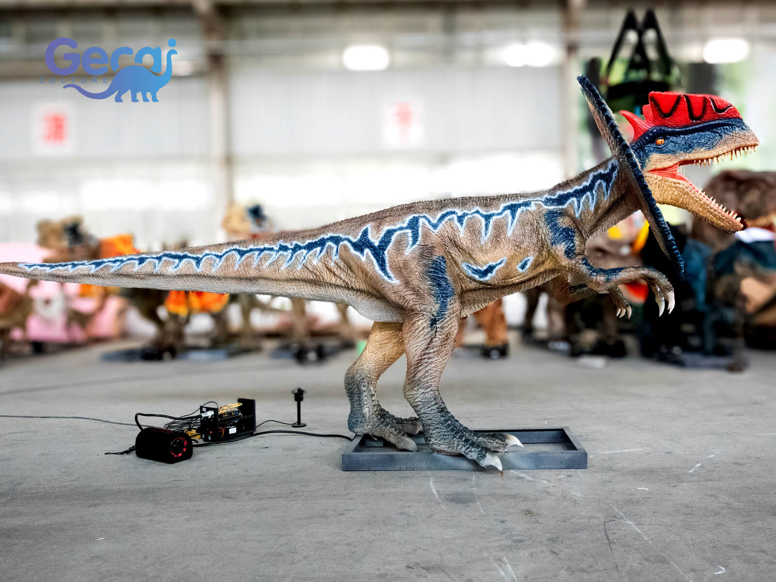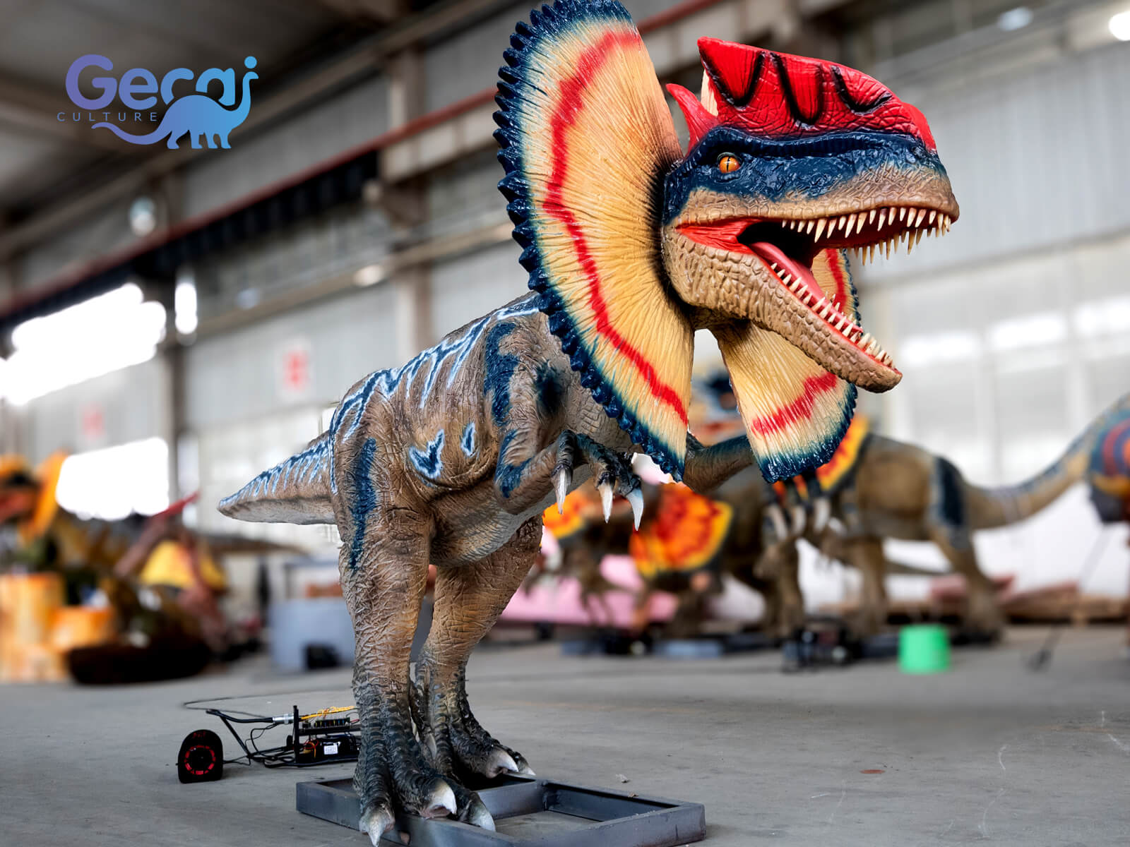 Designed with intricate details, the animatronic Dilophosaurus features textured skin, vivid coloration, and realistic movements, including head tilts, mouth openings, and tail sways. Equipped with sound effects that mimic its roars, it provides an engaging and immersive prehistoric experience for visitors.