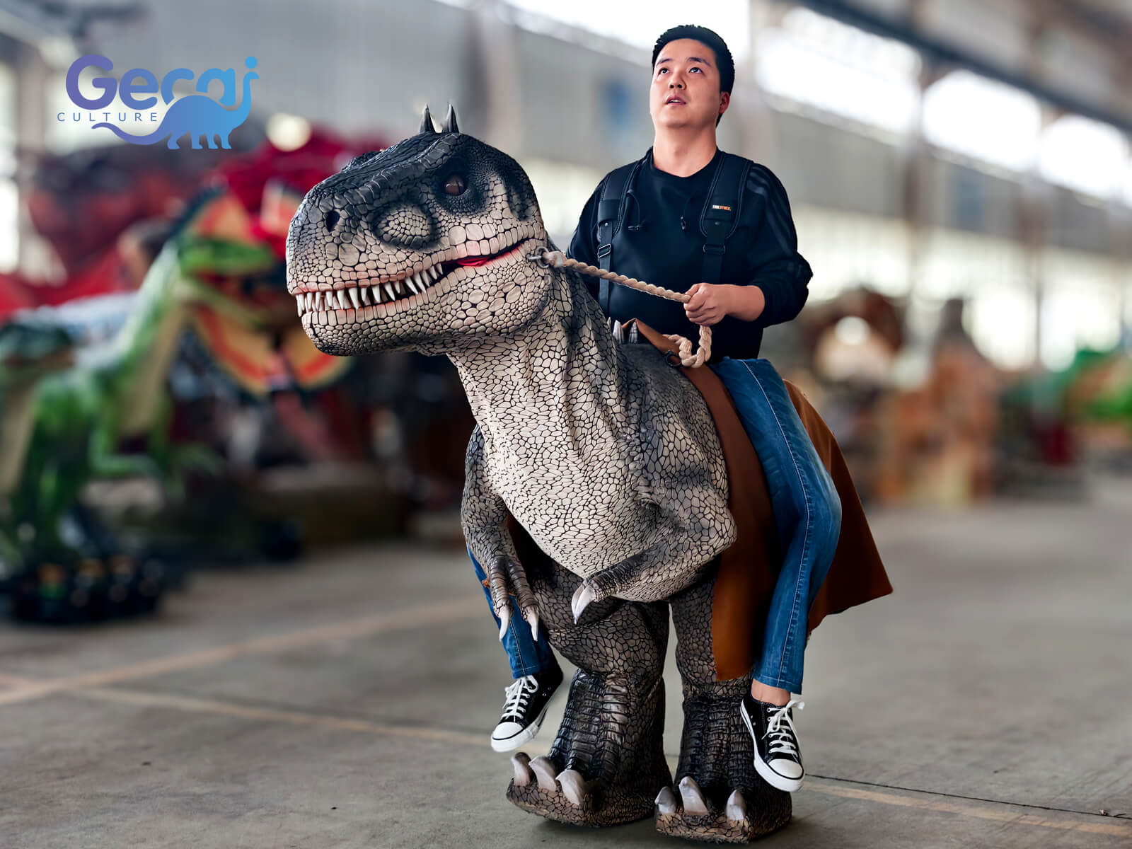 Customizable in color and style, this riding T-Rex costume is a lively and humorous addition that brings energy and attention to any event.